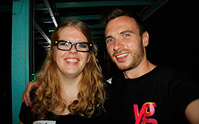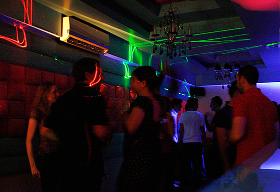 Daar moest dus flink wat aan versleept worden. We hebben dus een een dansvloer gecreëerd, de lampen gedimd, de gigantische blacklights aangezet, en de geleende laser op de spiegel gericht.