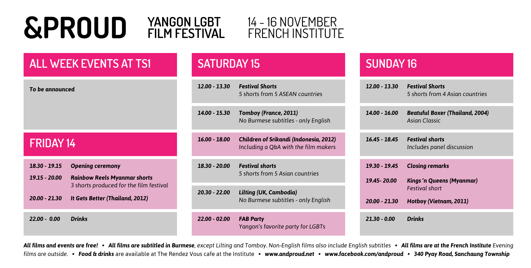 Vrijwillig projectje 2 is het &PROUD Yangon LGBT Film Festival dat eraan zit te komen. We organiseren dat met een core group van 5 man (met hier en daar wat hulp) en daar heb ik inmiddels bijna een full-time baan aan. Half november hebben we een 3 daags festival en we hebben 33 korte en lange films en docus uit 12 landen geselecteerd. Het zijn allemaal (Zuidoost) Aziatische films, geselecteerd op relevantie voor mensen in hier. En we hebben een workshop geregeld voor 10 jonge LGBTs uit Myanmar. Zij hebben geleerd hoe je moet filmen en hebben vervolgens 3 korte films geproduceerd voor het festival (we hebben 20.000 dollar binnengeharkt, dus het mag wat kosten…)